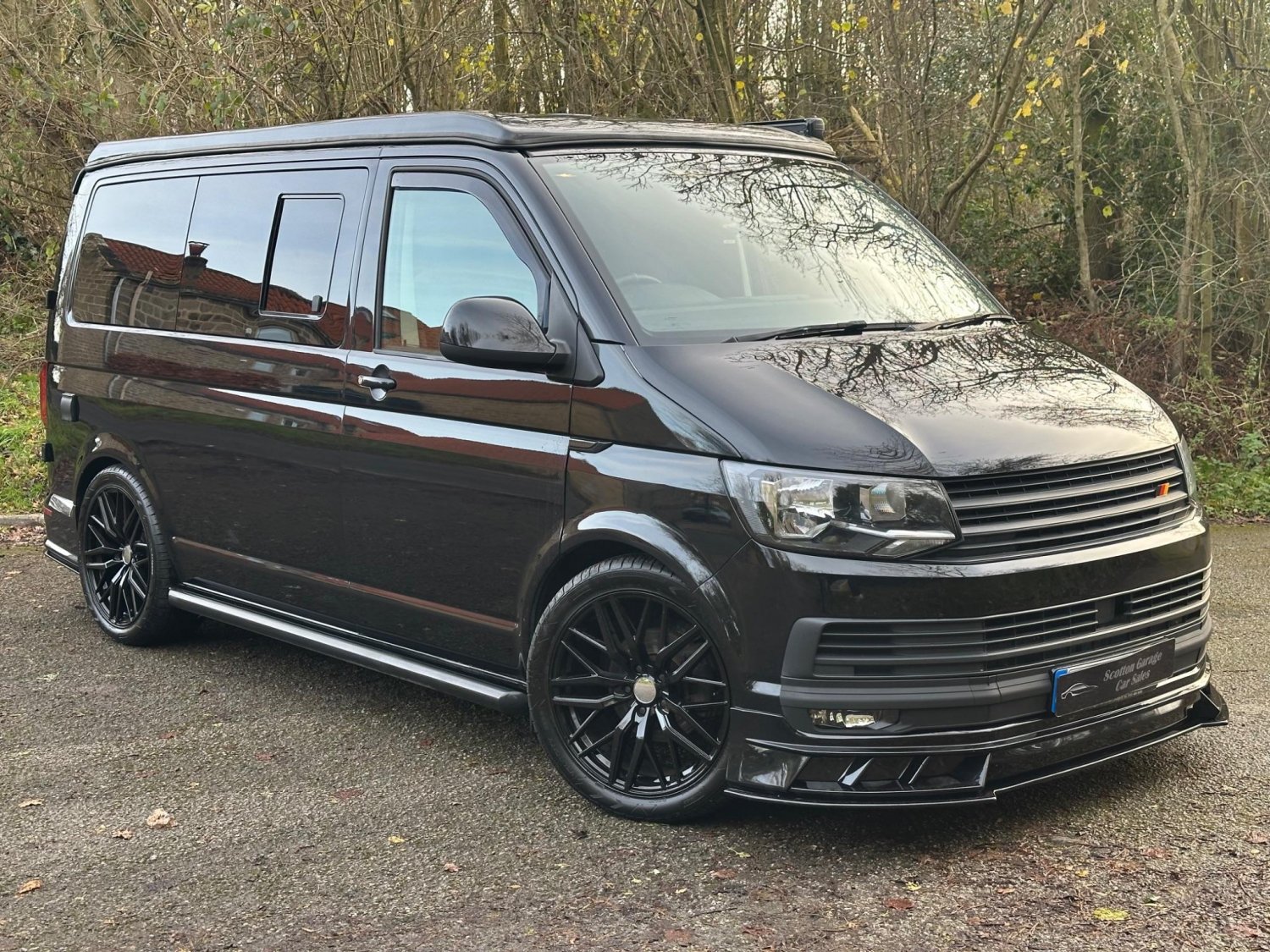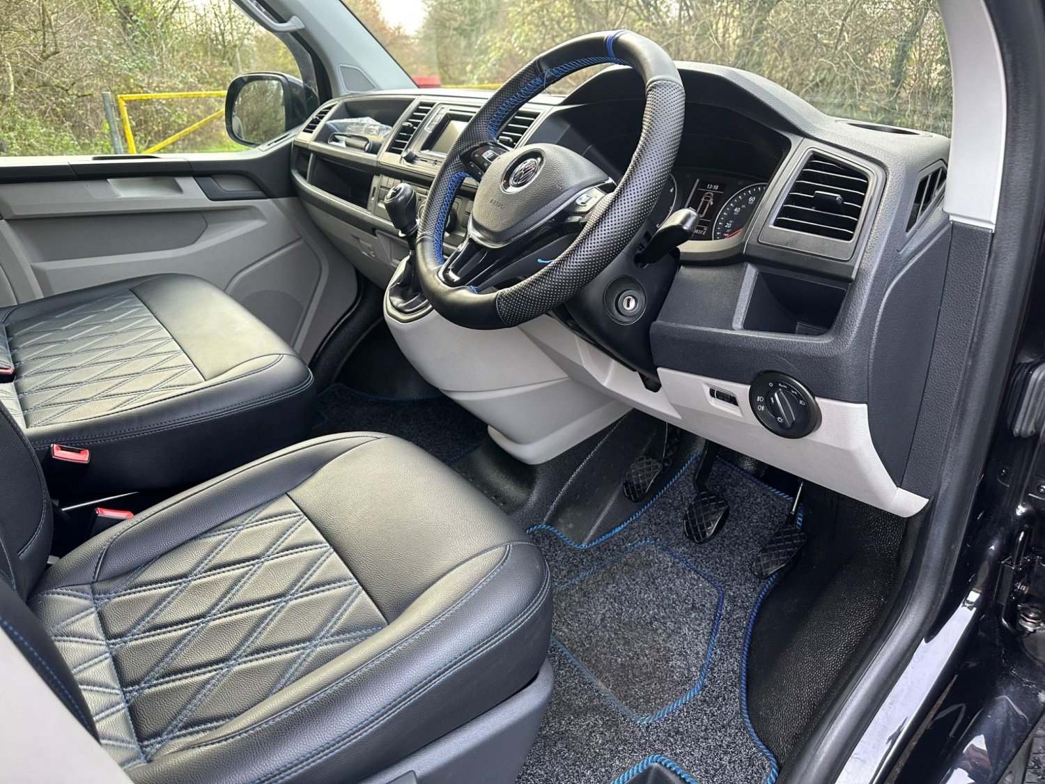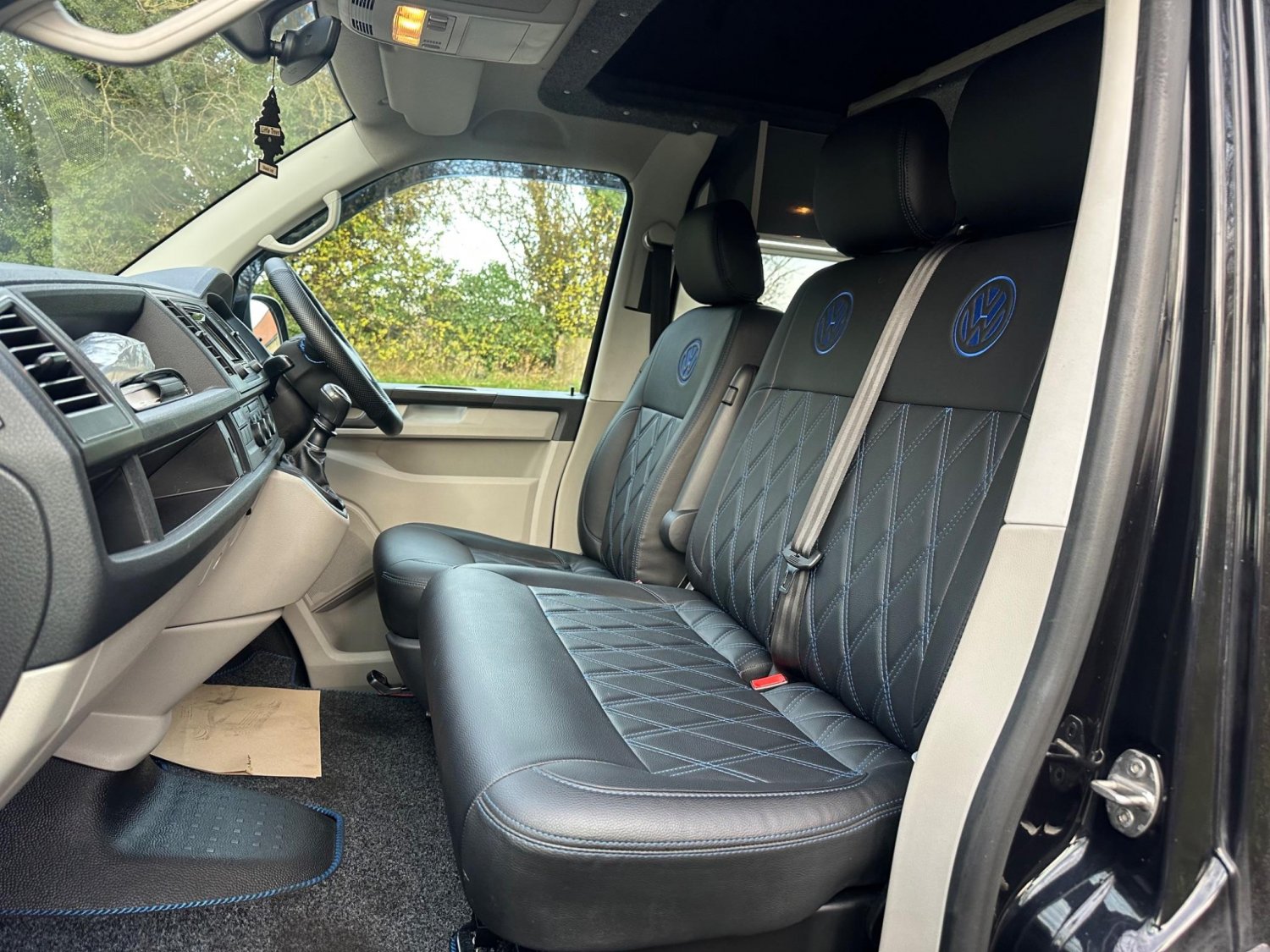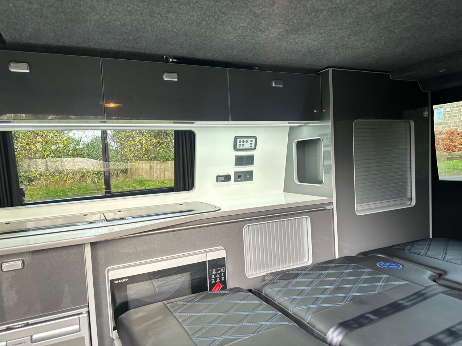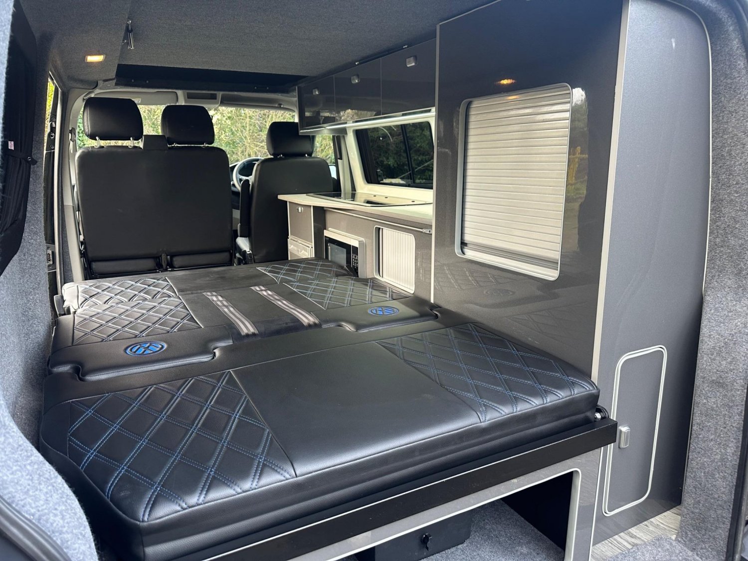 fantastic looking hi line T28 conversion by big wave campers , fitted solar panel , diesel healter , uorated wheels , front spoiler rear roof spoiler , privacy glass , full leather interior , roc and roll bed , pop top roof .